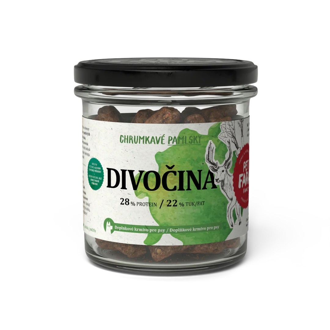 Křupavé sušenky pro psy z jeleního masa. Zvěřina pochází z českých a slovenských lesů. Skvělý tréninkový pamlsek za odměnu nebo odpolední svačina na výlety. Směs bylin na podporu trávení, ovoce a zelenina doplní vitamíny a minerály.